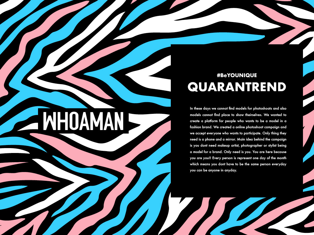 Whoaman is a gender-neutral body-positive activist fashion brand. It is for people who always live some problems with their body, gender etc. This brand is the biggest supporter of people who are marginalized by society. We aim to make people happy and comfortable with their insecurities. I focused on the campaigns it includes, photography print design and teasers for the brand. Every piece of print is about some skin sicknesses matching with animal prints like skin cracks and zebra, vitiligo and cow or freckles and leopard, etc. Our campaigns are based on our slogan #BeYounique. Shortly, it tells that you are unique because you are you and you don't have to change to be unique or unforgettable.