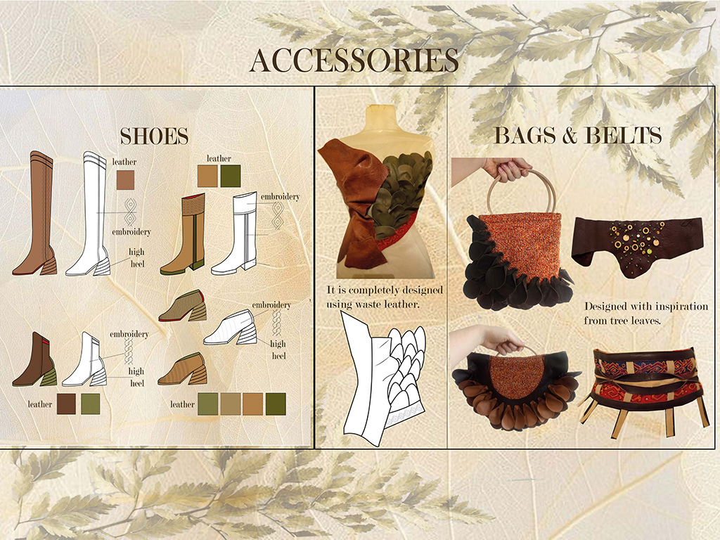 Sustainable design thinking is based on meeting our needs without harming the ecosystem. Following this approach, I decided to focus on what I already know and have experienced in my own life. In fact, there is a society in these lands named ‘Ağaçeriler’ that have lived a sustainable life since the eleventh century. They respect the nature in which they live; they live peacefully with nature and maintain a belief to not cut trees that have not dried out. The source of inspiration for this collection is ‘Ağaçeriler’.